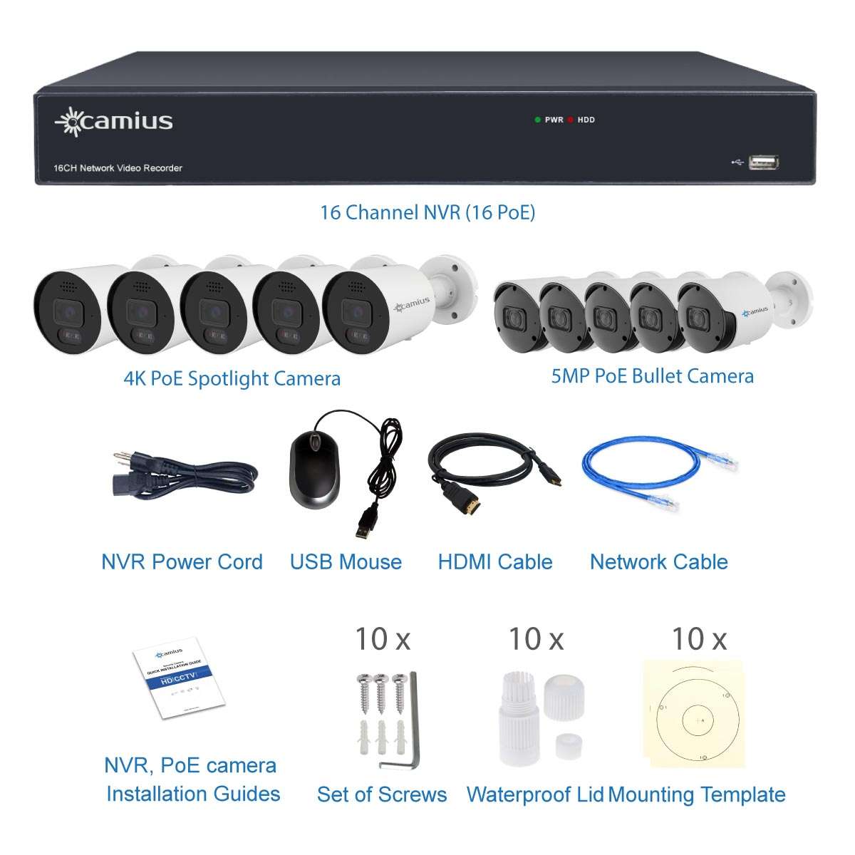 Camius offers a top-tier IP camera system with a 4K 16-channel NVR and ten PoE outdoor cameras. You’ll get five 8MP cameras with deterrent features and five 2K cameras. All cameras include wide-angle lenses, audio recording, color night vision, AI-powered smart detection, and durable metal casings. The system also provides 16TB of storage for extensive video recording.