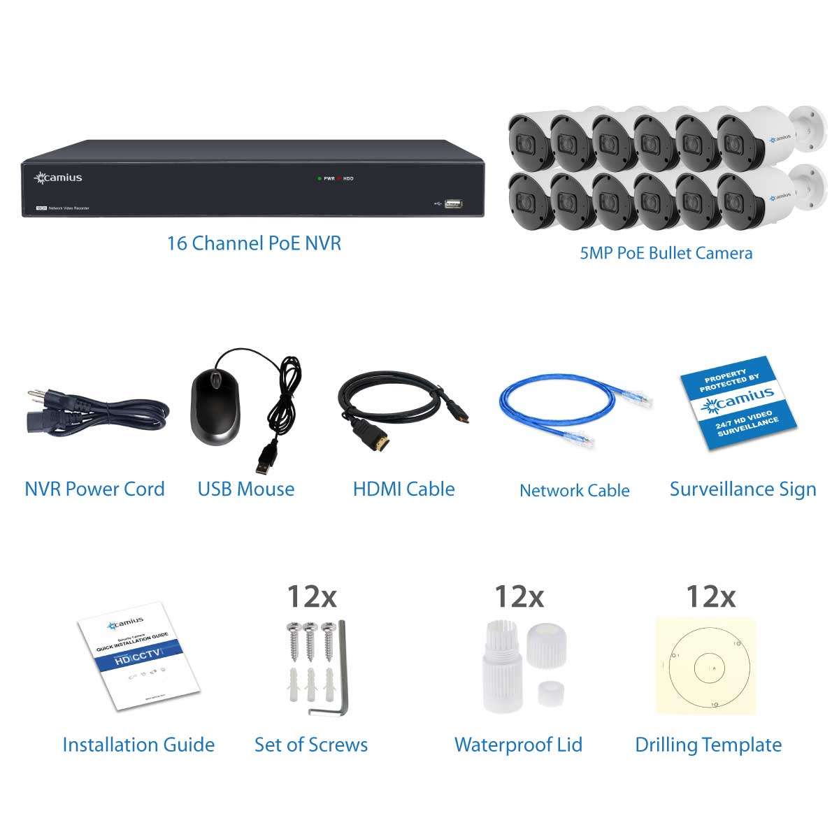 Camius 5 Megapixels PoE wired 12 camera system with an ultra HD 320Mbps high speed 16 channel NVR is one of the best camera systems for business and home security. Camius PoE NVR fits two internal SATA hard drives, which allows adding one more hard drive with up to 10TB. Moreover, there is a provision to add an external hard drive using the NVR’s eSATA port. The network video recorder comes with a 4TB surveillance hard drive and is ready for recording.