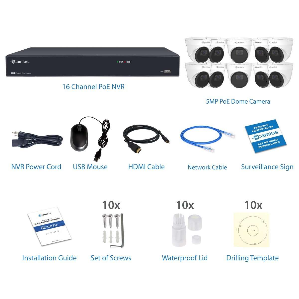 The Camius 10 camera security system is built for small and mid-size businesses that need reliable 24/7 monitoring. This PoE dome camera system includes ten 5MP IP dome cameras paired with a 16 channel NVR that delivers Super HD 2K video with audio. Smart AI features include human and vehicle detection, sound alerts, line crossing, perimeter intrusion, and cross-counting analytics. With reports and alerts built into the NVR, this dome surveillance camera system gives business owners complete control without subscription fees.
