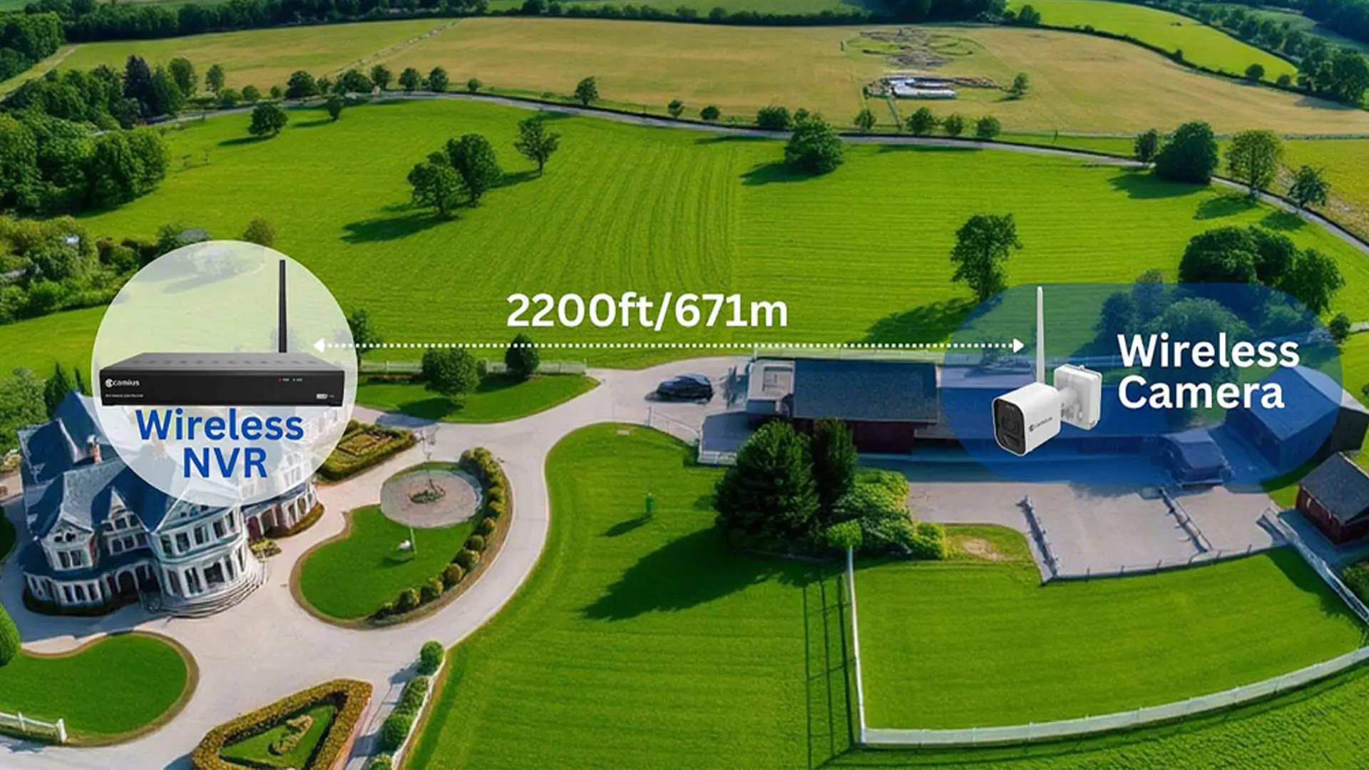 Camius wireless security camera system features a direct, long-range wireless connection between the cameras and the NVR, reaching up to 2,200 feet (671m) in clear line of sight with no obstacles. This connection operates independently of your router’s Wi-Fi, providing a more stable and extended range—ideal for large properties, remote areas, and sites with weak or inconsistent Wi-Fi signals.