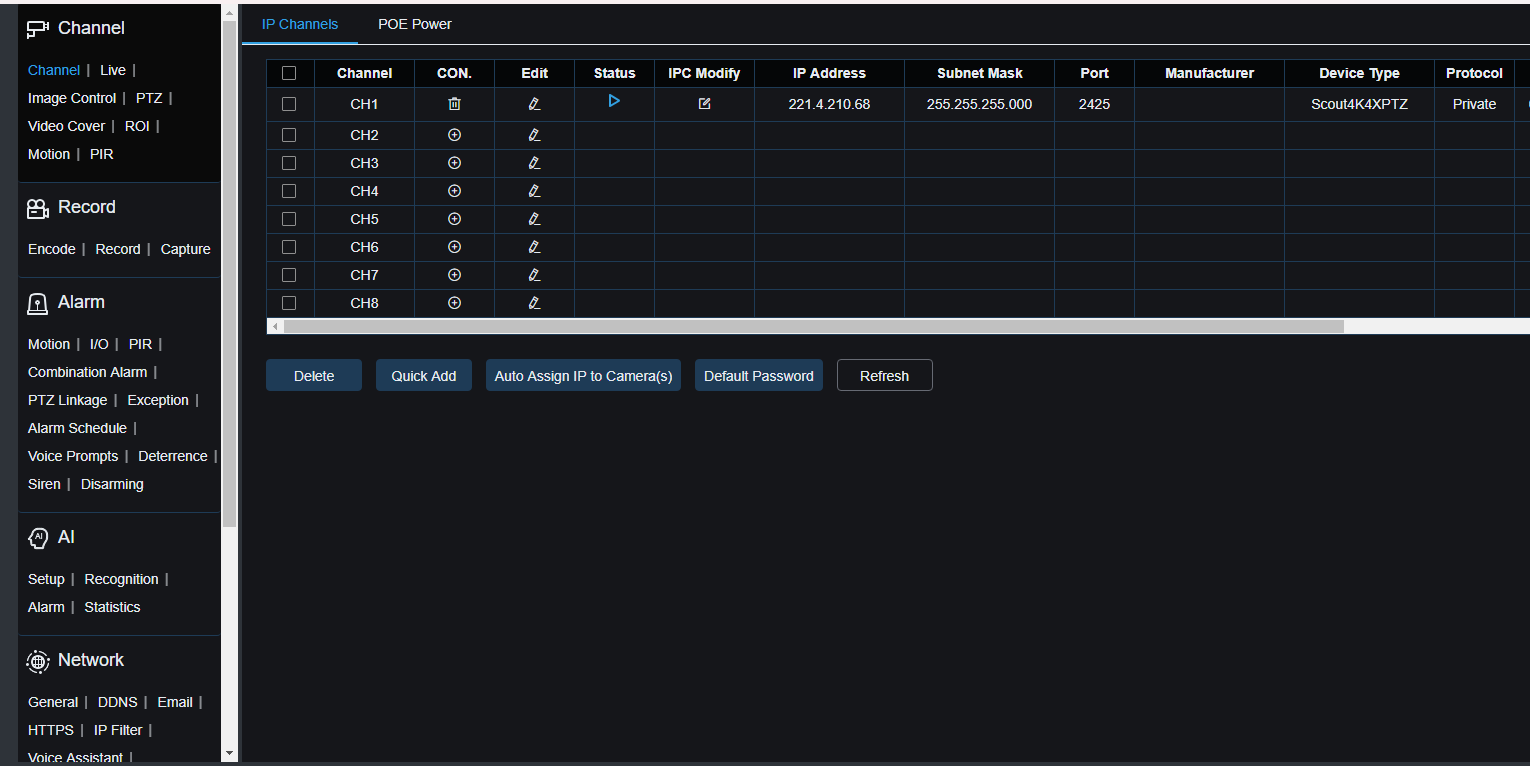 To set this up, go to Settings >> Alarm >> PTZ Linkage >> Select the triggering channel (e.g., a fixed camera detecting motion). Choose the PTZ channel (SCOUT4K4XPTZ). Assign up to 4 presets for the camera to move to when an event is triggered.