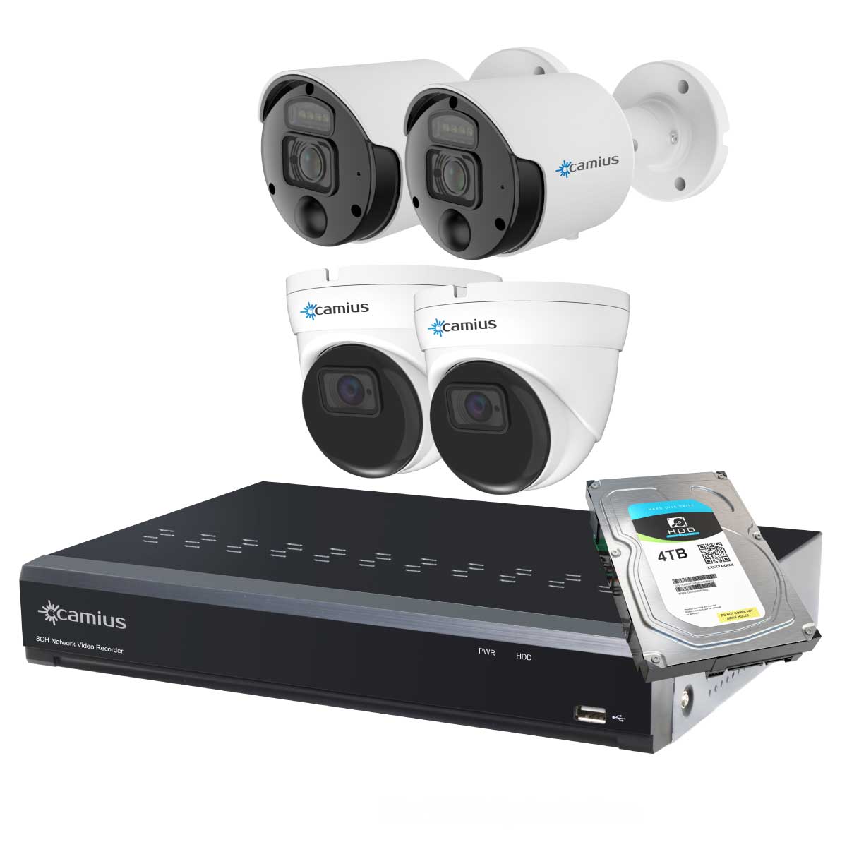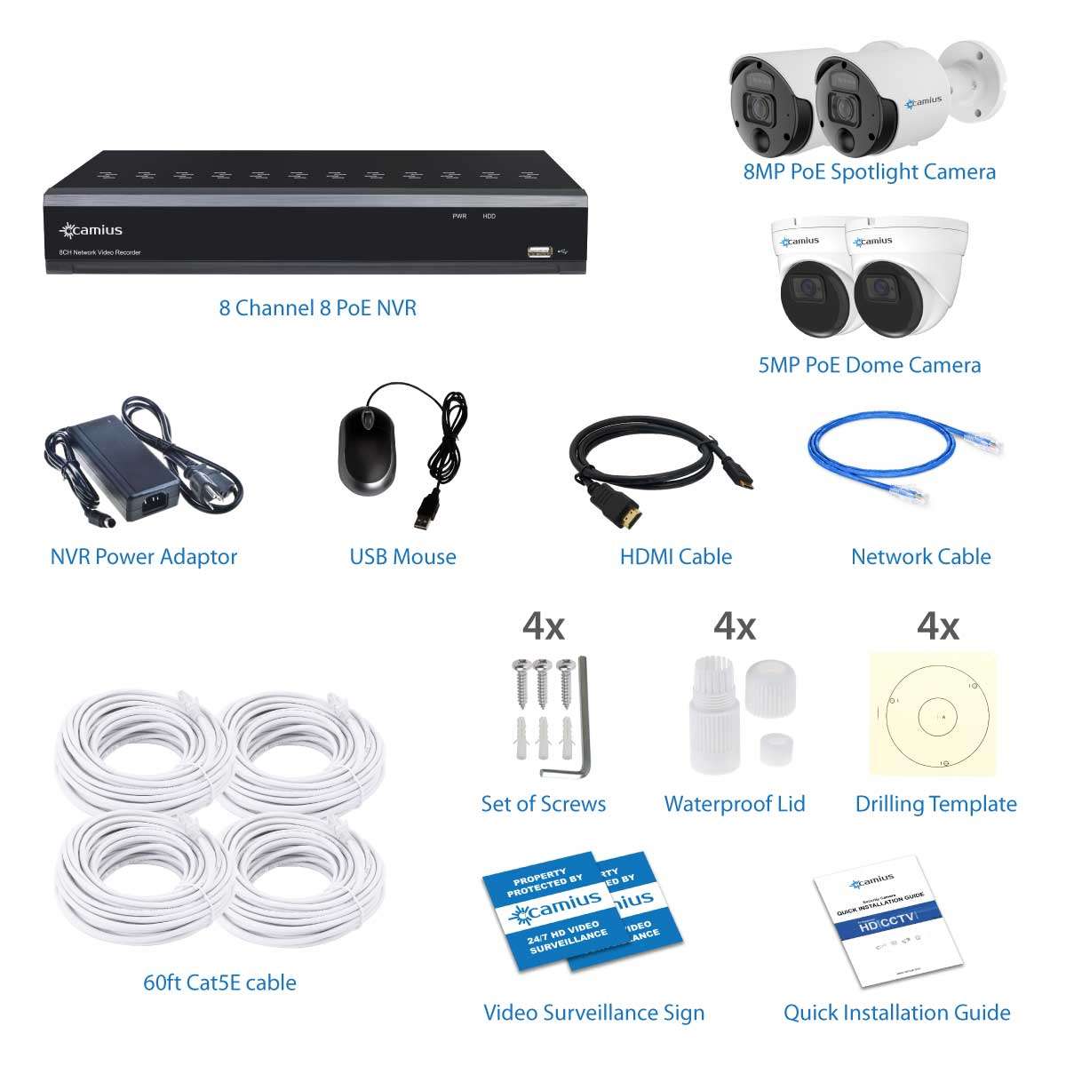 The latest 8 channel NVR system with 4K Spotlight Outdoor Cameras and 2K Dome cameras delivers the best audio and video monitoring and recording features. In addition, spot8R outdoor cameras provide an essential security feature: deterrence. Motion Activated Spotlight Cameras illuminate visible and bright lights into the scene, which deters crime. You can turn the spotlight on and off using the Camius View app; schedule deterrence features to only be active during certain hours and days of the week. In addition, the spotlight feature allows for clear color video in complete darkness; this helps identify subjects. The 5 Megapixels PoE dome cameras are great for monitoring large areas with sound and motion detection.