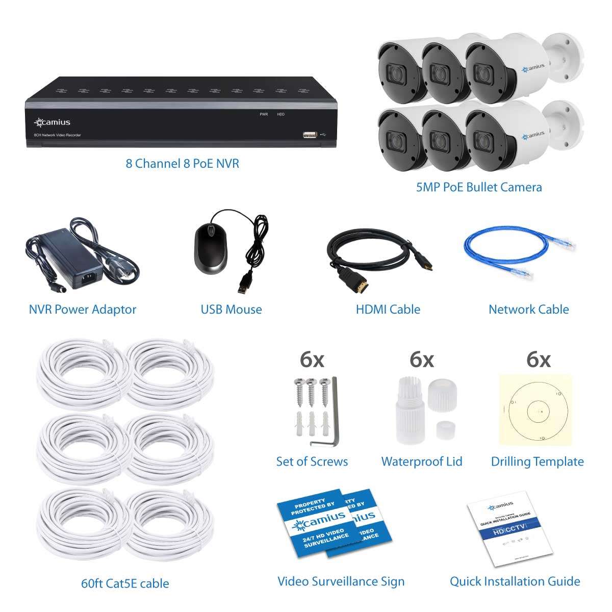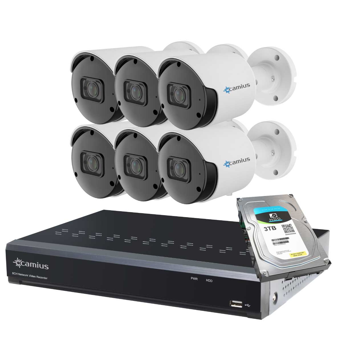 Camus’s latest 8 Channel NVR 6 outdoor camera system is a complete plug-n-play audio video surveillance solution for your business and home security. PoE outdoor camera system’s pre-installed 3TB HDD (internal hard drive disk) makes your NVR cameras Kit ready for 24/7 Surveillance Camera Recording. You can upgrade the 4K NVR Security Camera System 3TB hard drive to 10TB. The latest H.265 & Audio compression saves up to 50% storage space. Expand to 8 camera security system by adding two more Camius PoE outdoor and indoor security cameras.
