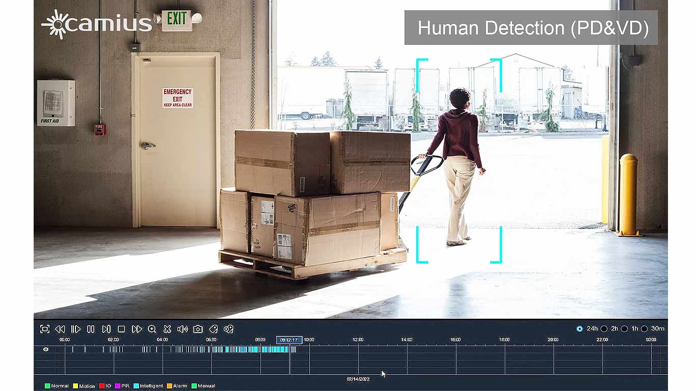 Camius dome cameras use AI technology to bring advanced detection to your business surveillance system. Set custom zones to monitor specific areas and movement patterns. Key features include human and vehicle detection, perimeter intrusion, line crossing, and cross-counting. The system can trigger recording, email, or push alerts, and mark events with color-tagged video for quick review. Follow the Human & Vehicle Detection guide for setup and best results.