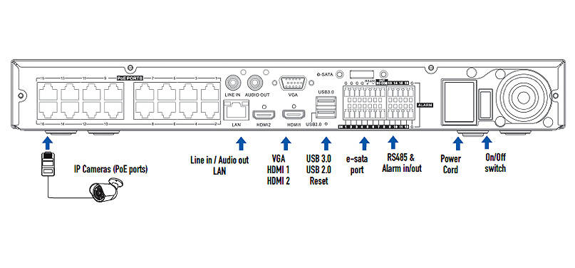 - Plug PoE IP cameras directly into the NVR PoE ports, or connect them through a network switch.