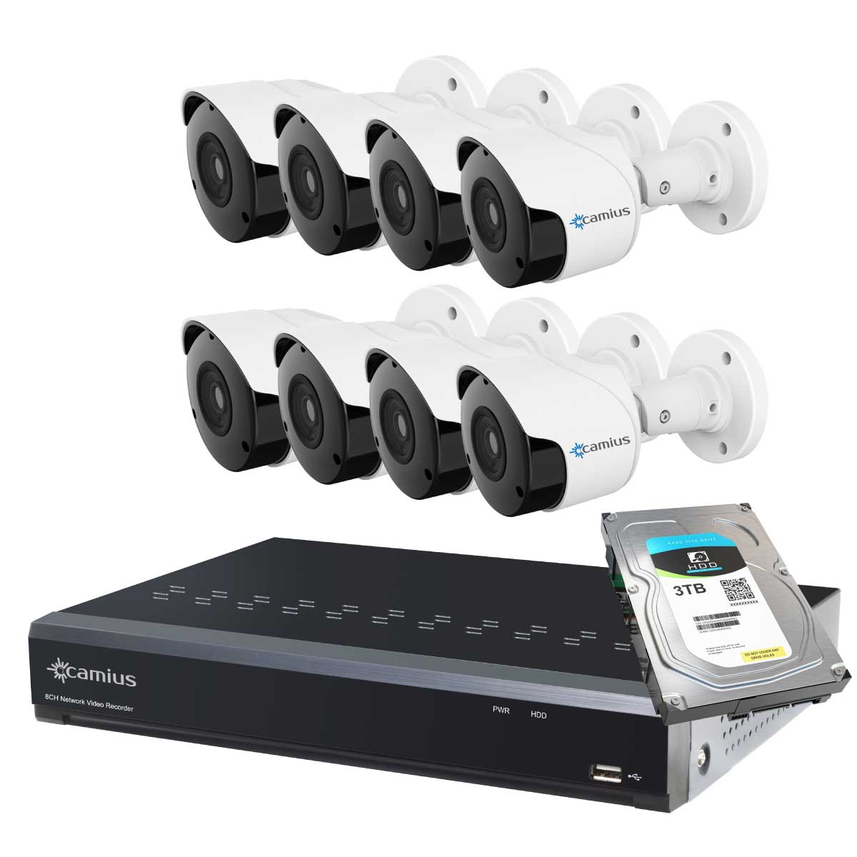 These 8 Outdoor Security Cameras with Night Vision and built-in microphone for audio recording is a complete IP solution for your business and home surveillance needs. The Network Video Recorder is shipped with a pre-installed 3TB (terrabyte) internal hard drive ready for recording and storing weeks and even months of footage.