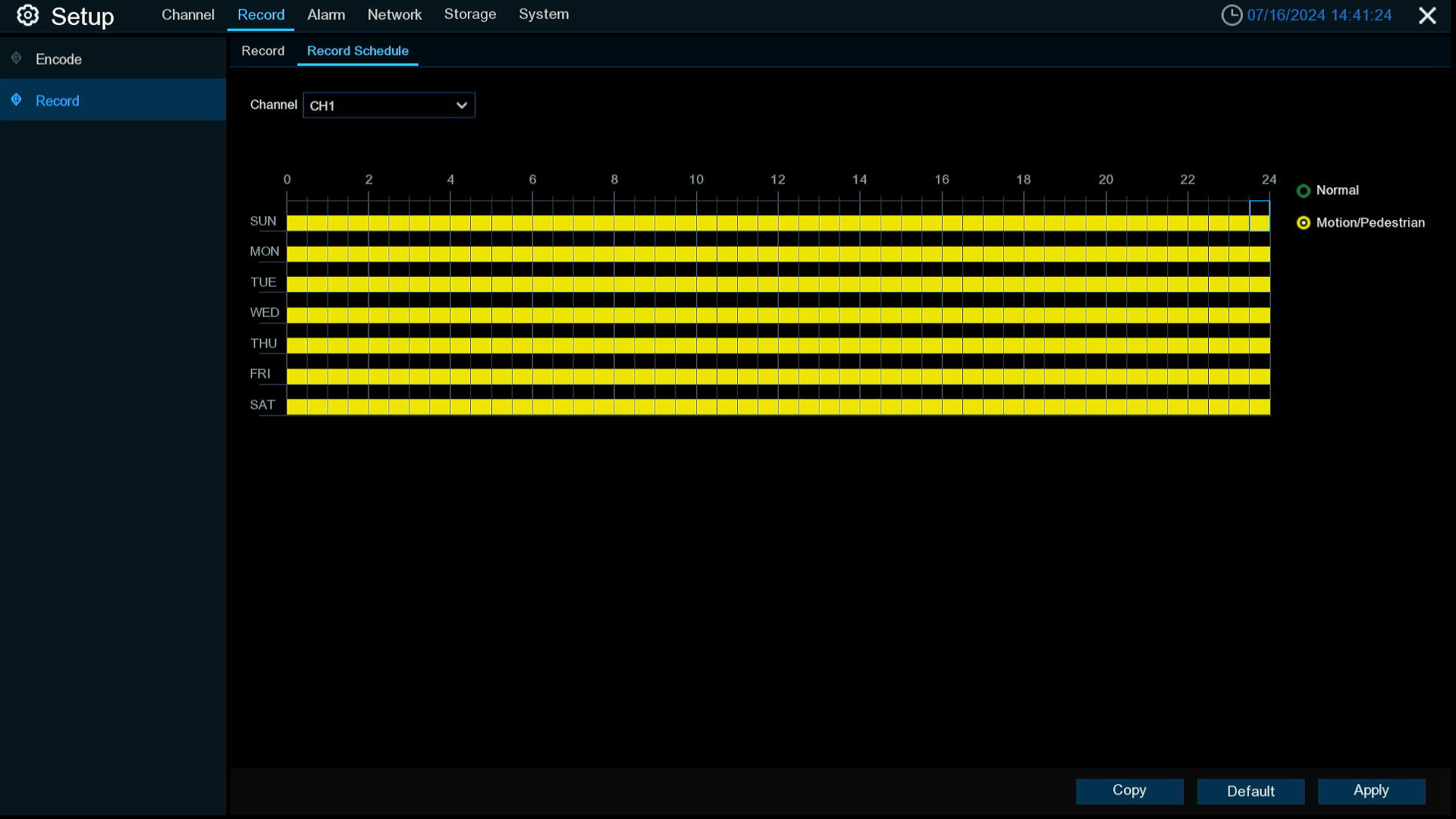- Motion/Pedestrian: When the area is marked in yellow, it means that the channel records Motion/Pedestrian detection events during that time slot.
