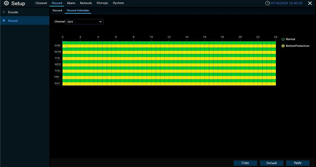This menu allows you to specify when the NVR records video and determine the recording mode for each channel. The recording schedule allows you to set a recording schedule, such as Normal (Continuous) recording every day (or hour), Motion/Pedestrian detection recording times. To set the recording mode, click on the mode radio button (“Normal”, “Motion/Pedestrian”), and then drag the cursor to mark the area. The recording schedule is only valid for one channel. If you want to use the same recording schedule for other channels, click on the Copy (Apply) button to use the copy function. Click on Apply to save the settings.